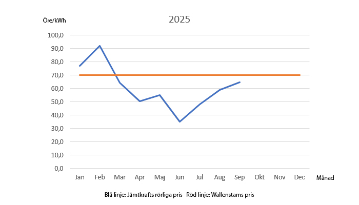 Nedan finns information om vårt elpris i jämförelse med rörligt pris från Jämtkraft som är vår samarbetspartner inom elhandel. Från 1 januari 2025 är priset 70 öre/kWh (ex moms).