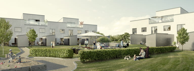 Som sig bör är väderstrecken söder och väster. Husen, som är placerade i ett L, ramar in en gemensam trädgård med plats och unika möjligheter för lek, grill och avkoppling.