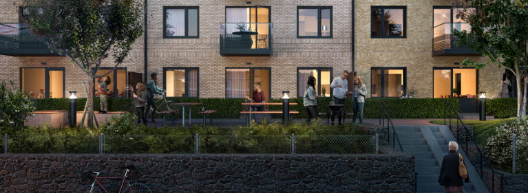 Söra Kvarter i Centrala Åkersberga har härligt gröna innergårdar. Här har vi byggt ett boende med närhet till service, butiker, skolor, fritidsaktiviteter och skärgården. Roslagsbanan är bara 450 meter bort och via den når man Östermalm på 30 minuter.